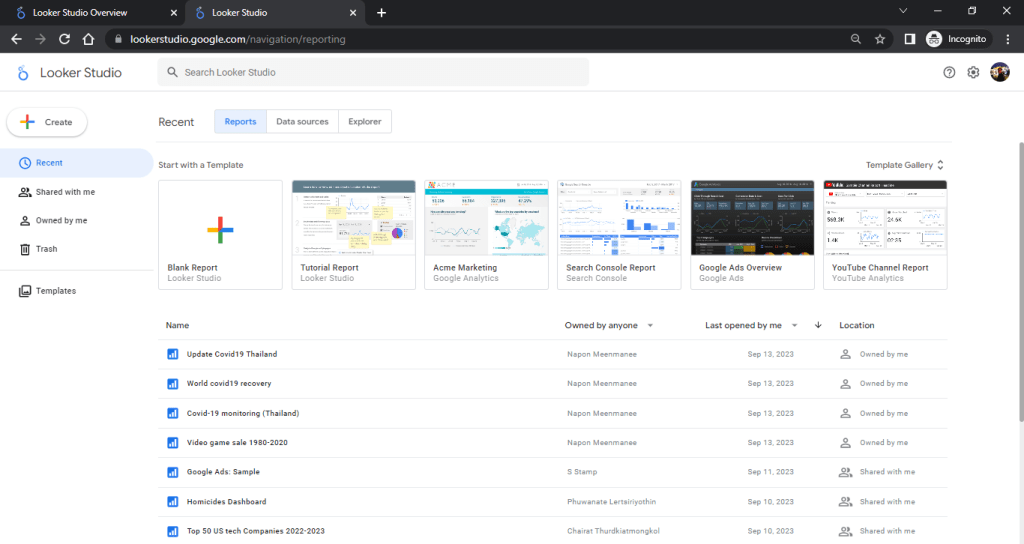 1. ให้เราเข้าไปที่หน้าเว็บของ Looker Studio ตาม linkนี้ได้เลยครับ https://lookerstudio.google.com เมื่อเข้ามาแล้วจะมาอยู่ที่หน้า home page
