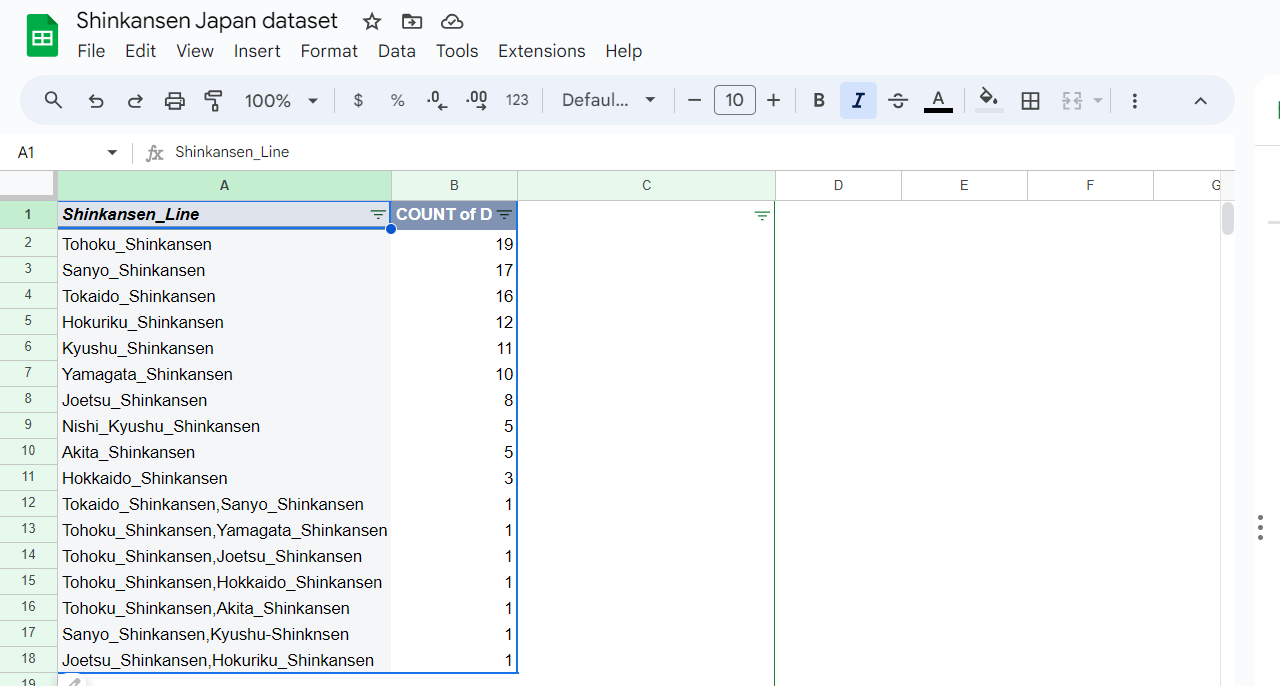 - ส่วน Q2: รถไฟ Shinkansen สายไหนที่ผ่านสถานีเยอะที่สุด? ดูข้อมูลเร็วๆจากกราฟตอบได้เลยครับ นั่นก็คือ! สาย Tohoku Shinkansen นั่นเอง ซึ่งปลายทางของสายนี้จะไปสุดที่ Shin-Aomori station (อ้างอิงจากข้อมูลไม่นับที่วิ่งต่อสาย Hokkaido นะคร้าบ)