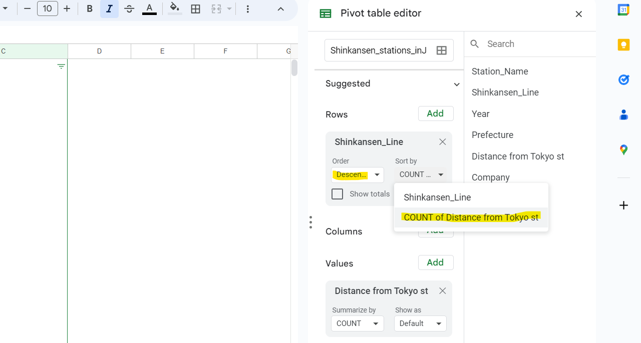 ในส่วน Shinkansen_Line ให้ตั้ง เป็น Descending Order และ Sort by COUNT of Distance from Tokyo st