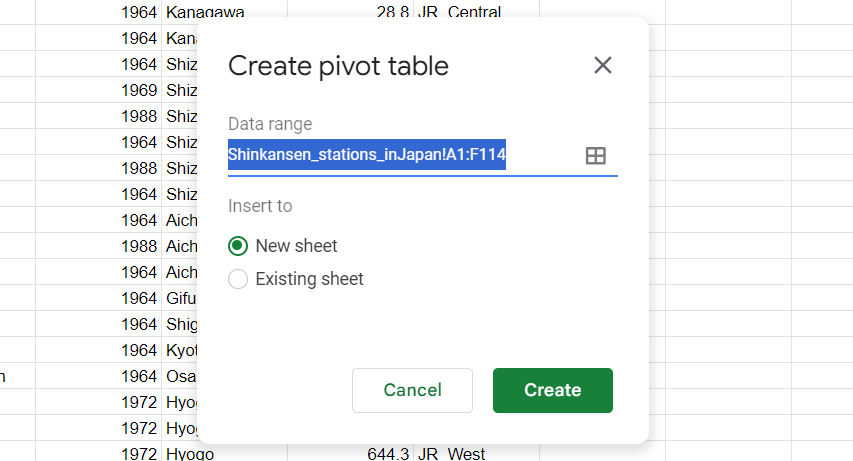 เสร็จแล้วให้เลือก Insert to > New sheet เพื่อให้ pivot table เราไปขึ้นที่ sheet ใหม่ แล้วเลือก Create