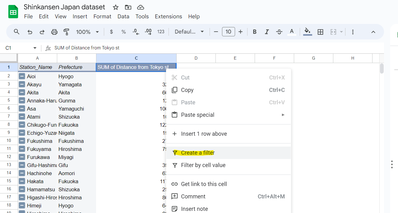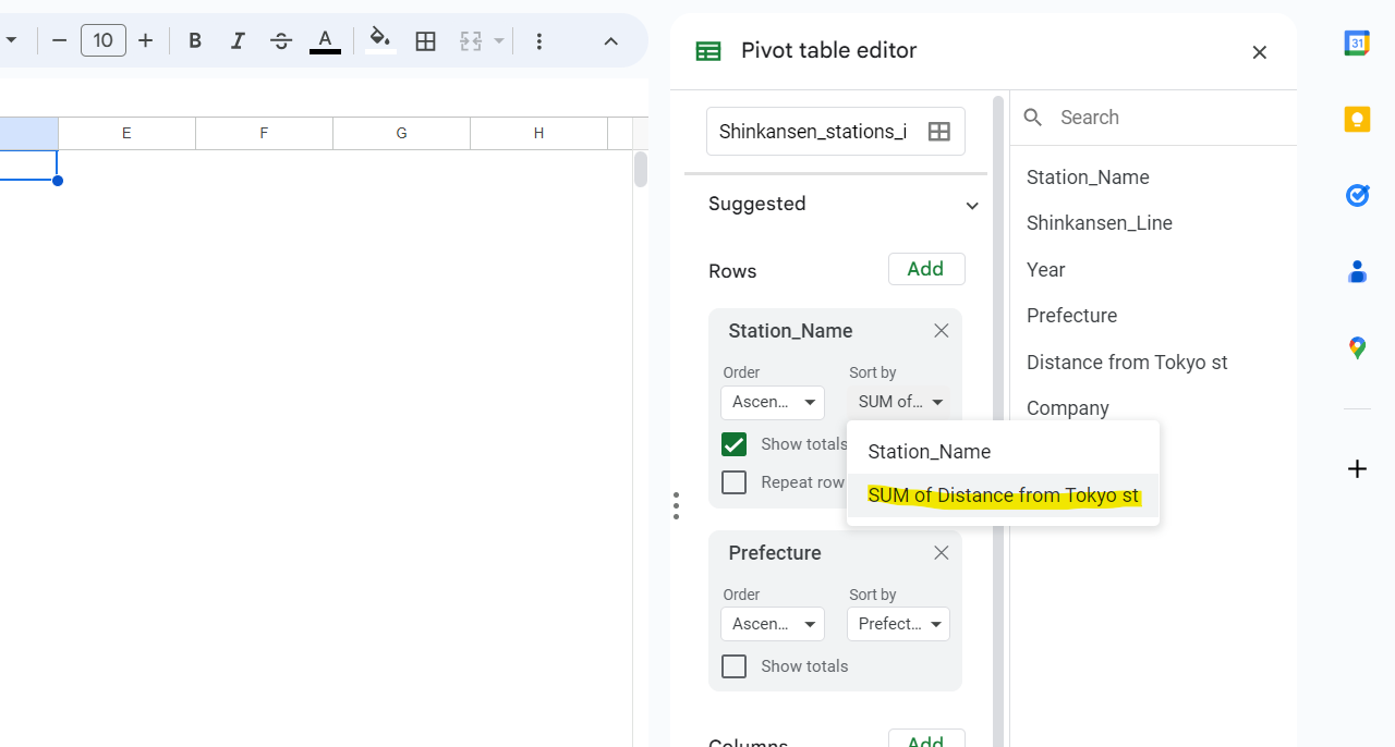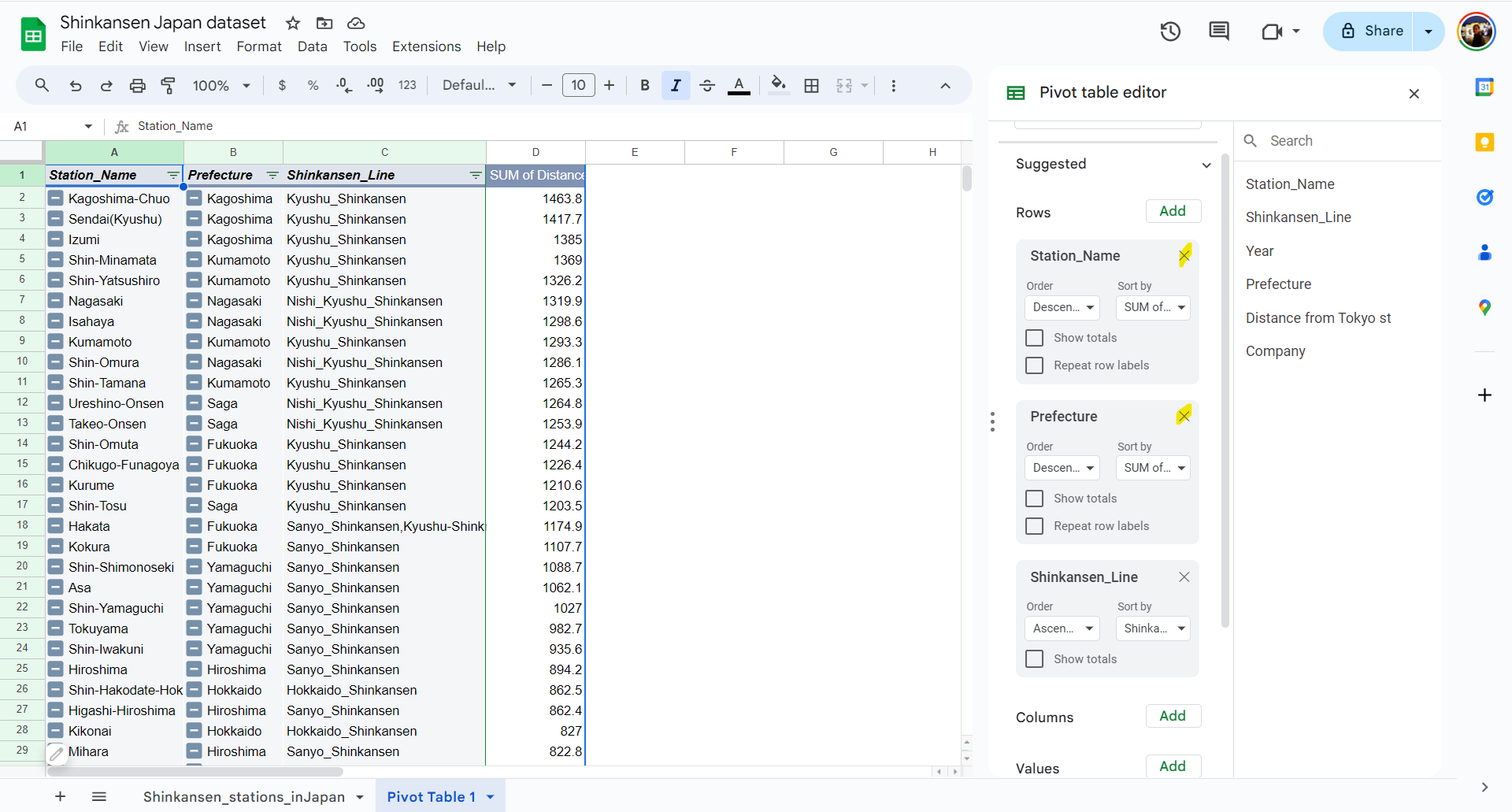 เปลี่ยน Sort by ของ Station_Name เป็น Sum of Distance from Tokyo station