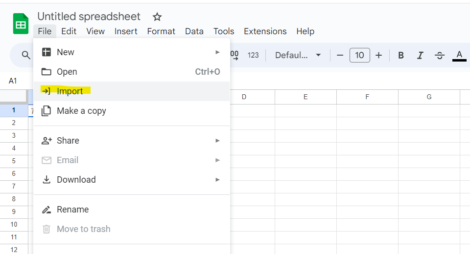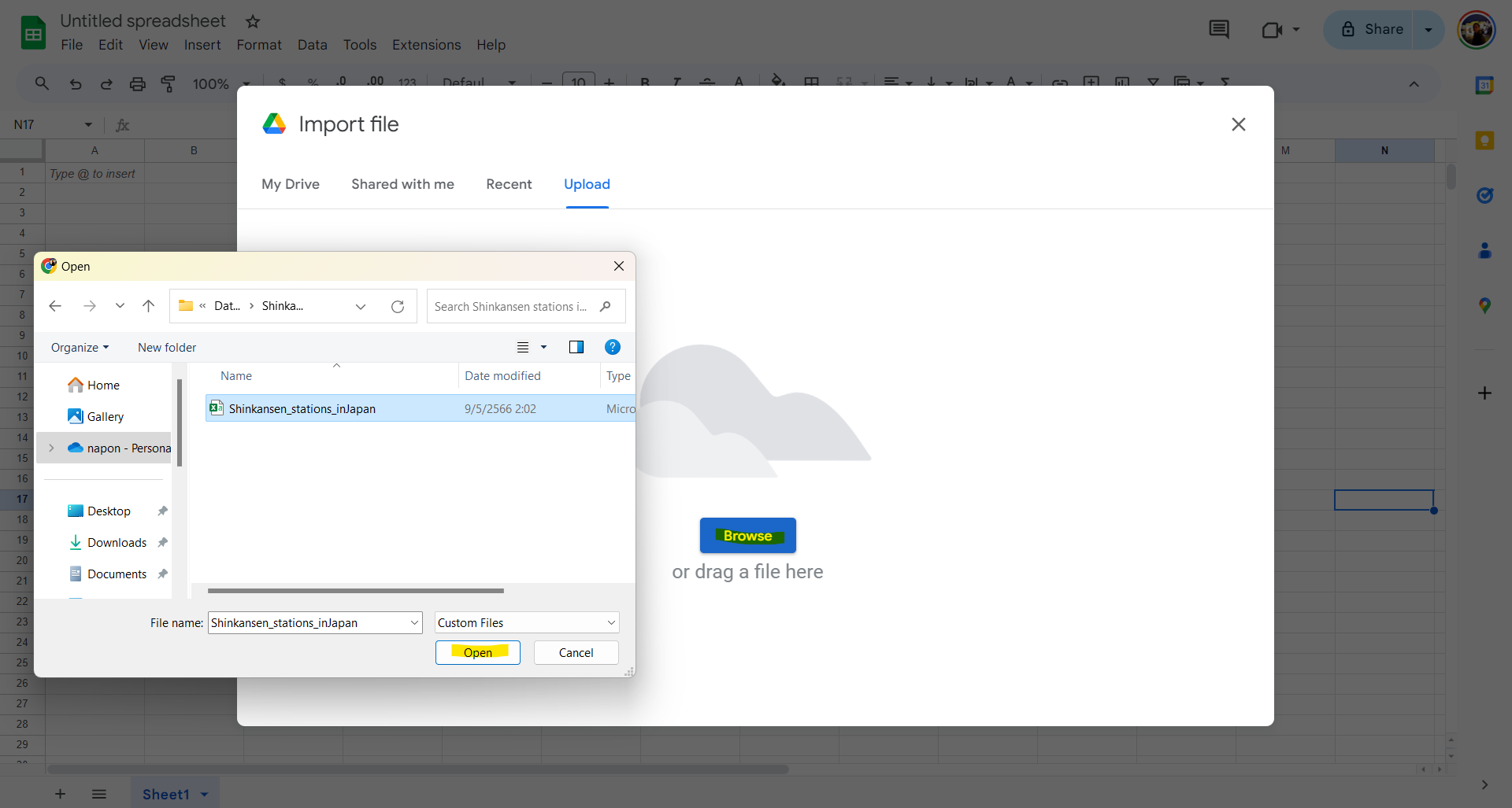 เข้าไปที่หน้า google sheet แล้วเลือก file > import เพื่อ import dataset ที่เราโหลดมาจาก kaggle ลงไปครับ