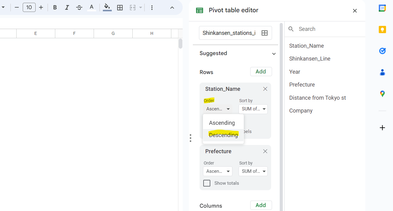 เลือก Order ทั้ง Station_Name และ Prefecture เป็น Descending เพื่อเรียงจาก มากไปน้อย (Ascending order คือเรียงจาก น้อยไปมา นะครับ)