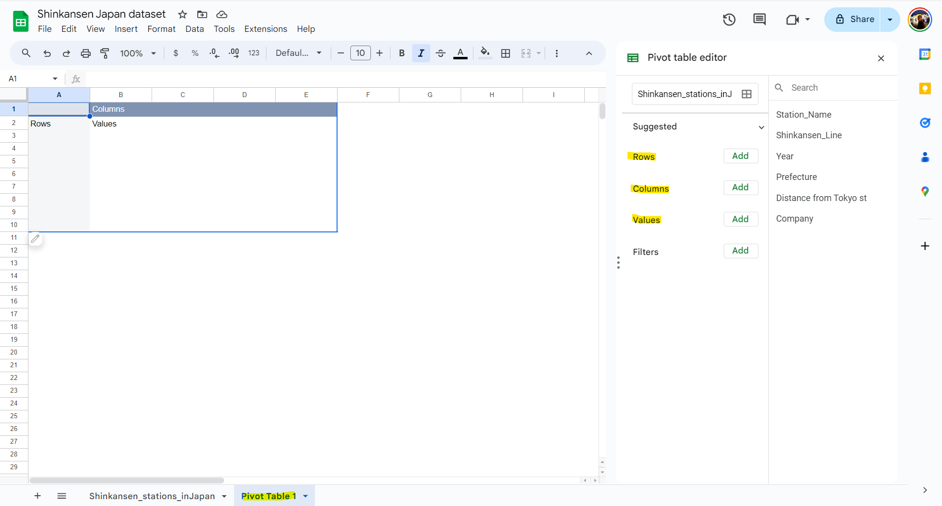 ให้นำข้อมูล Station_Name และ Prefecture ออกไปจากตารางโดยการกดปิด ให้เหลือแต่ Shinkansen_Line