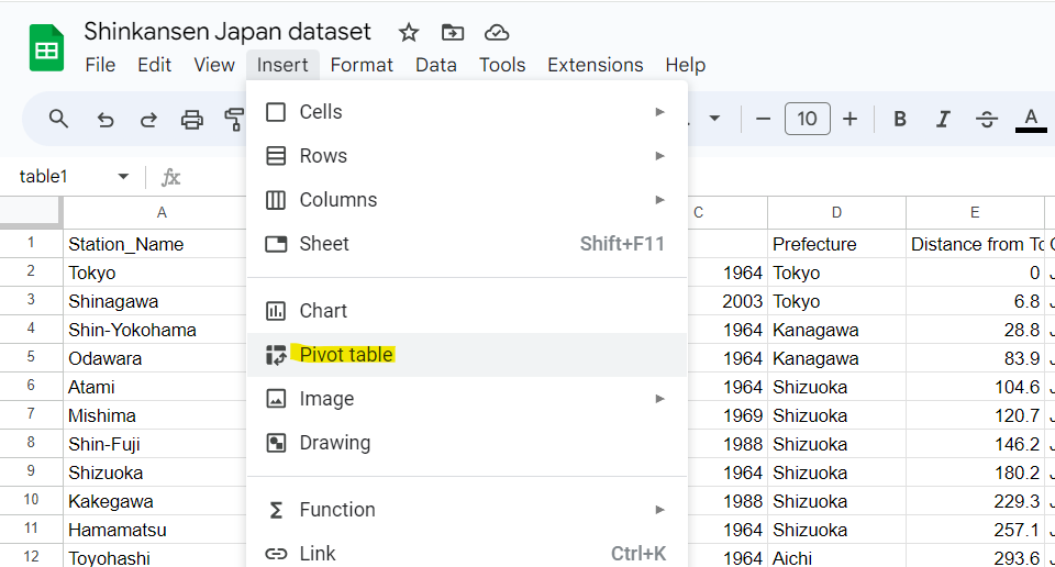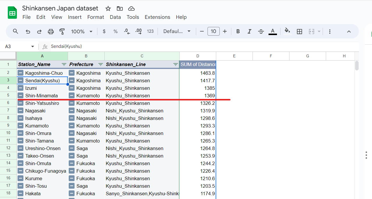 - กลับมาที่คำถามของเรานะครับ Q1: 5 อันดับแรกของ Shinkansen station ที่อยู่ไกลจาก Tokyo ที่สุดคือสถานนีไหนบ้าง? จาก pivot table แรกจะเห็นว่าสถานีที่อยู่ไกลที่คือ Kagoshima-Chuo station ที่ เกาะ Kyushu ทางใต้ของประเทศญี่ปุ่นนะคร้าบ