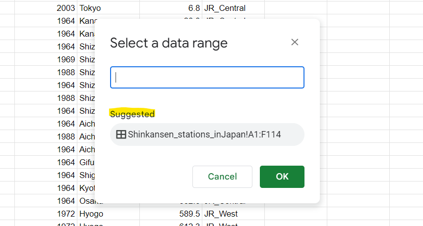 ให้ใส่ range ของ data เราลงไป (หรือให้เลือกรูปตารางสี่เหลียมทางด้านขวา จะทำให้เราเลือกคลุม cell เองได้ และ google sheet ยังฉลาดที่จะ suggest range ให้เราเลือกเลยก็ได้ครับ)