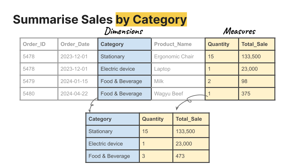 1. ผลรวมของยอดขาย (measure) แยกตาม Category สินค้า (dimension) (ข้อนี้ตามรูปตัวอย่างด้านบนเลยครับ)