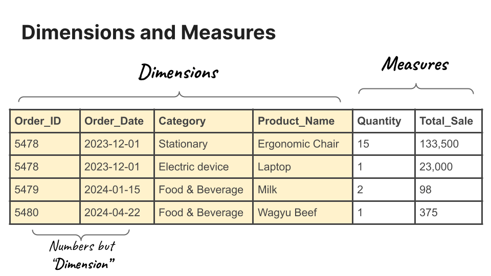 Dimension คือข้อมูลที่ไว้แบ่ง category ของ row หรือ record นั้นในตาราง นอกจากตัวเลขตามที่ว่ามาแล้วก่อนหน้านี้ ก็จะมีแบบเป็น text ใช้ในการแบ่ง category ด้วย เช่น ประเทศ จังหวัด หมวดหมู่ กลุ่มสินค้า ฝ่าย แผนก ตำแหน่ง etc. โดย Dimension จะใช้เป็นหลักในการ สรุปข้อมูลแยกตาม category (summarize by category)