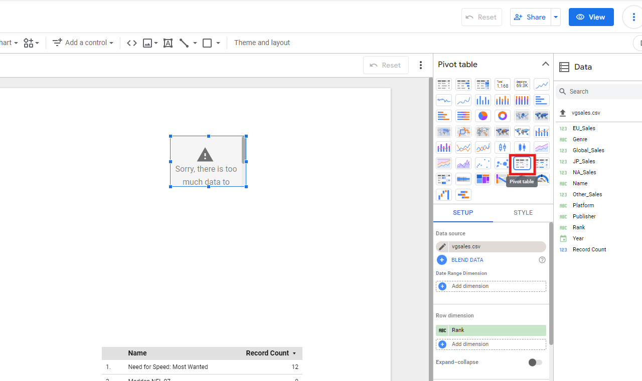 - ให้เราลองลาก Year มาใส่ ในข้อ Row dimension ในแถบ Setup โดยวางทับแทน Rank ไปได้เลย แล้วเราจะได้ Pivot table ขึ้นมาครับ