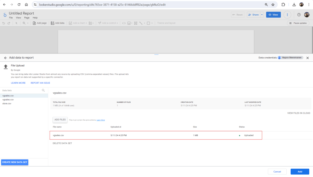 - จะมารายละเอียดไฟล์ที่ต้องการ upload ขึ้นมา ให้ click “Add” แล้ว Looker จะ preview asd