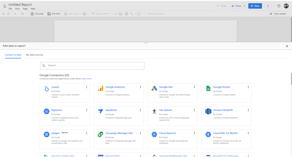 หลังจากที่สมัครใช้งาน Looker และสร้าง report ใหม่ขึ้นมาแล้ว จะมีแถบ Add data to report ขึ้นมาให้เราเลือกวิธีที่จะ import ข้อมูลของเราเข้ามาใน Looker ซึ่งหลักที่จะได้ใช้บ่อยก็จะมี Google Sheet, File Upload, BigQuery, Google Analytics และ SQL Data จาก platform ต่างๆ