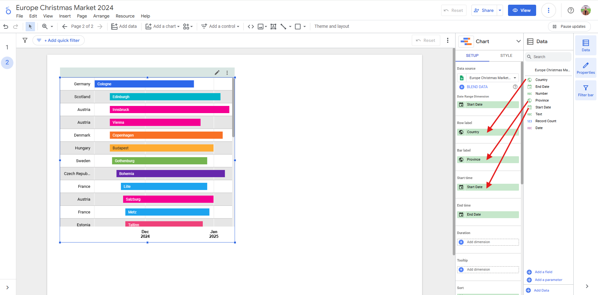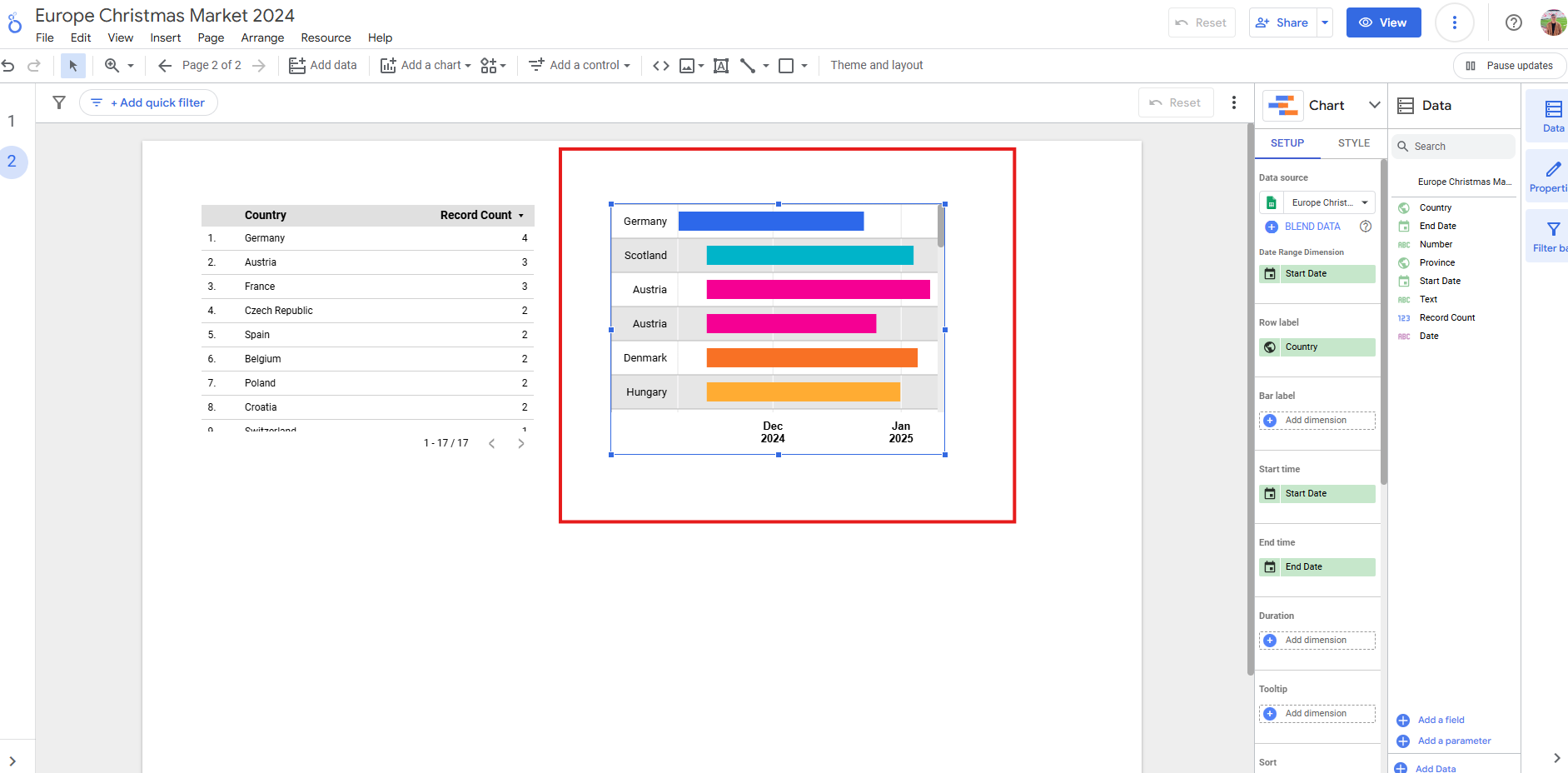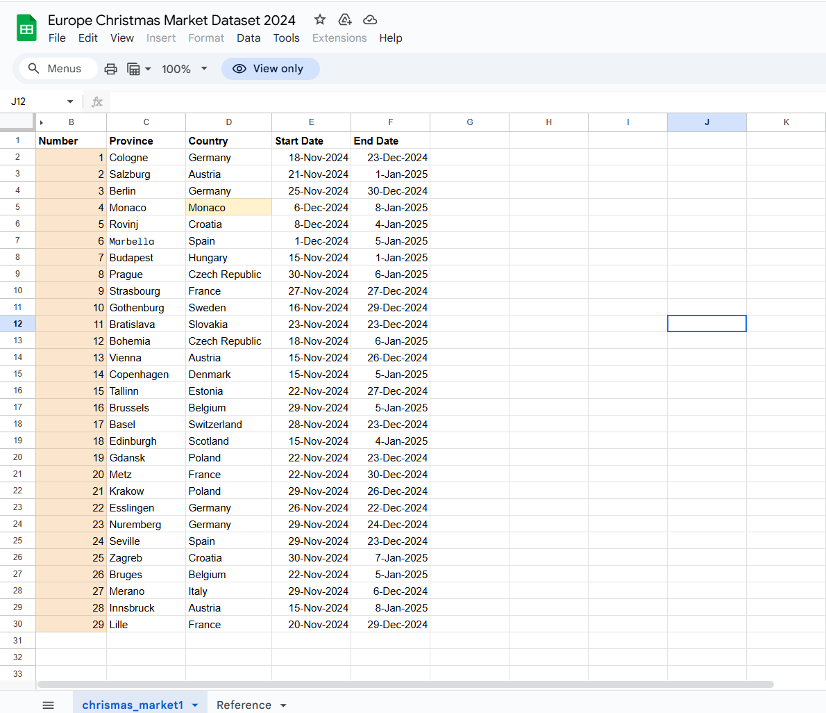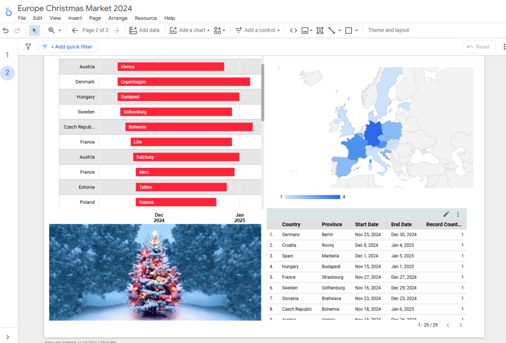 สุดท้ายทุกคนจะได้หน้าตาของข้อมูลตามรูปด้านล่างนี้ ซึ่งถ้าใครที่อยากจะเอา Template หรือ ข้อมูลของผมไปใช้เลยให้เข้าไปที่ Europe Christmas Market Dataset 2024 แล้ว Copy เป็นไฟล์ของตัวเองโดยเลือก File > Make a copy ได้เลยครับ