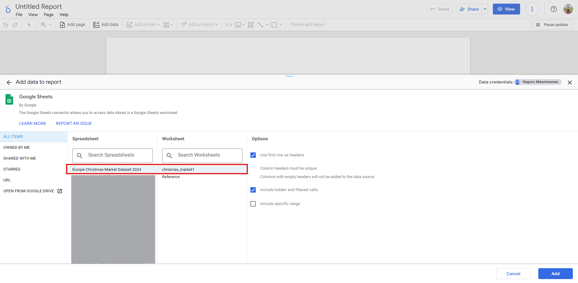 Connect data โดยเลือก Google sheets ที่เราเตรียมข้อมูลไว้
