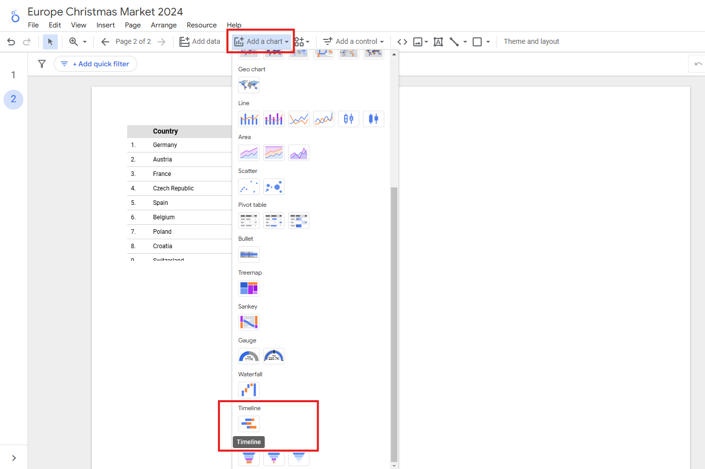 ให้เรามาที่ Add a chart กดเข้าไปแล้วเลื่อนลงมาหา chart ที่ชื่อ Timeline แล้วคลิ๊กเลือกได้เลย จากนั้นเลือกตำแหน่งที่ต้องการวาง chart แล้วก็คลิ๊กอีกที ใน canvas จะมี timeline chart ขึ้นมา