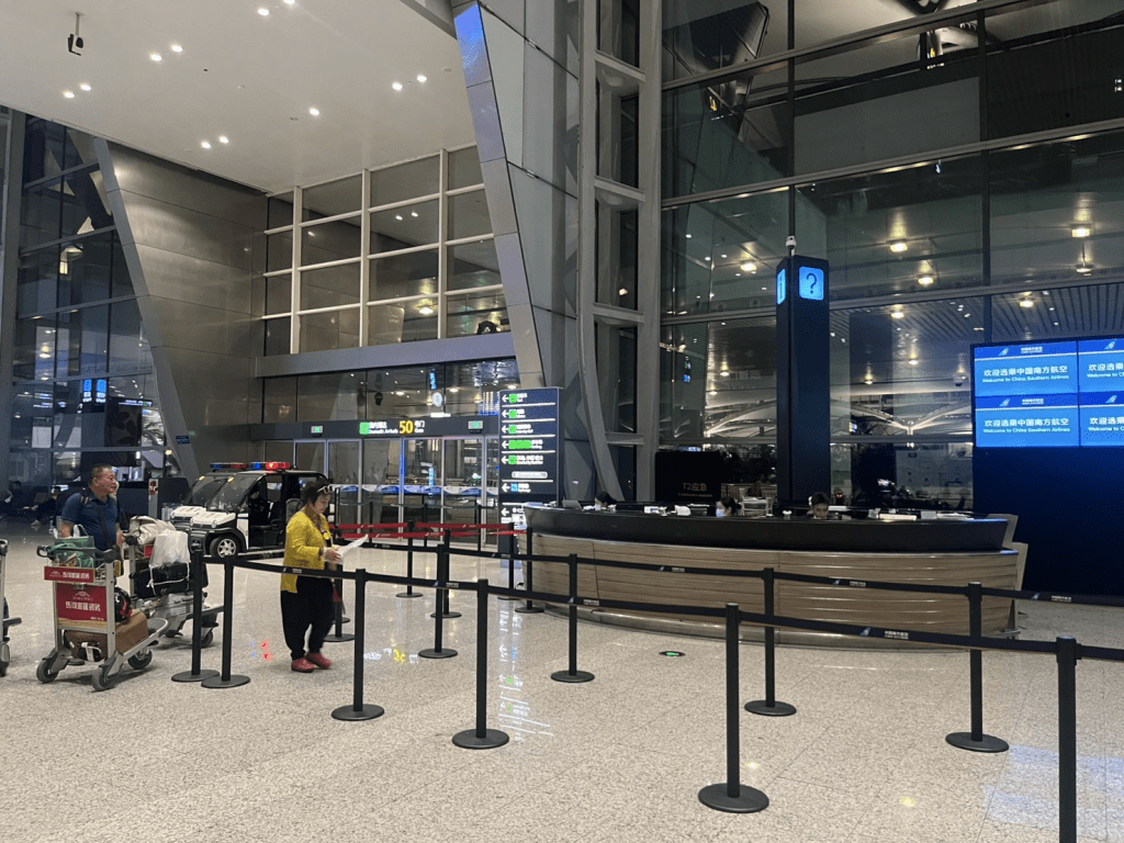 ลงมาจากเครื่องให้ผ่าน ตม ออกมาเลยแล้วไปที่เกท 50 จะมีเคาท์เตอร์ของ china southern อยู่ให้เอา boarding pass ให้ เจ้าหน้าที่ แล้วจะได้รับสติกเกอร์ติดเสื้อมา เพื่อให้ จนท มาเรียกเราไปขึ้นรถบัสไป รร อีกที