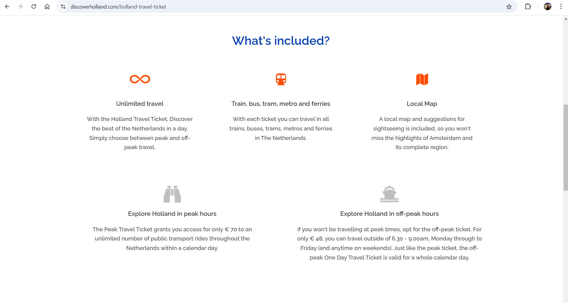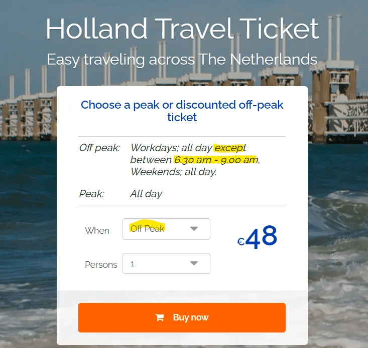 Tip อย่างนึงคือ Holland Pass จะมี 2 ราคาคือ peak: 70 euro และ off-peak 48 euro (การเดินทางนอกช่วงเวลา peak 6.30 am – 9.00 am) ดังนั้นถ้าเราไม่จำเป็นต้องจ่ายแพงหากเราเลือกเวลา off-peak ที่ถูกกว่าเยอะมากได้