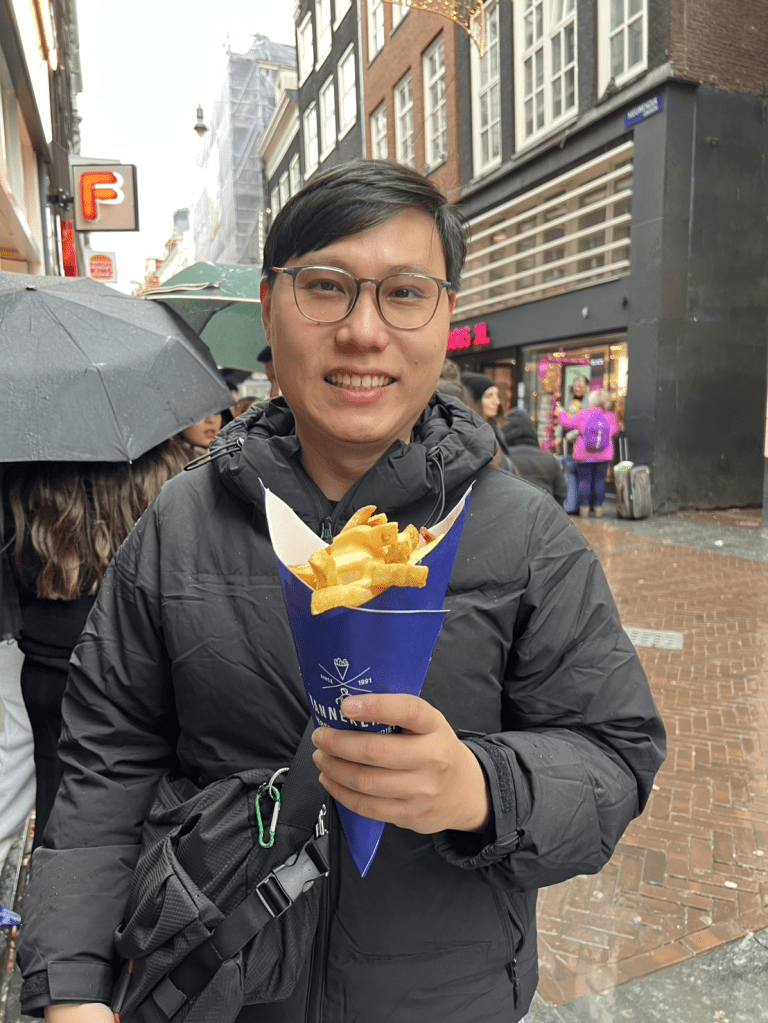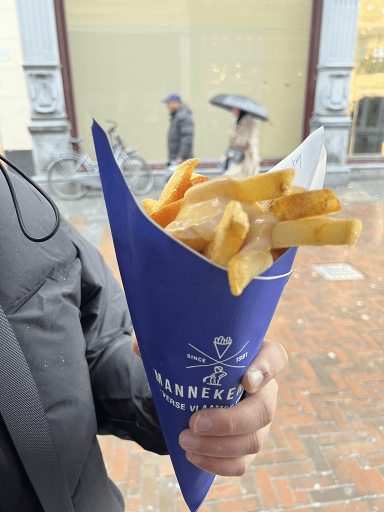 ช่วงรีวิวของกิน เดินๆอยู่เห็นคนต่อซื้อเฟรนช์ฟราย(ที่นี่เรียกเป็น Holland Fries) กันเยอะมากเลยโดนป้ายยา ให้เข้าไปซื้อด้วย อันนี้แค่ sixe M ก็คือได้เยอะอยู่ครับ ร้านชื่อ Manneken pis ที่ Amsterdam เห็นอยู่ 2 สาขา