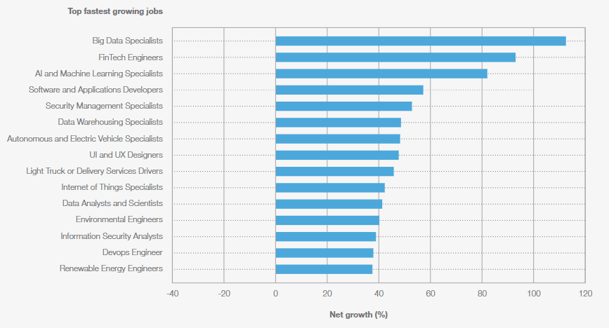 หน้า 19 พูดถึง Fastest-growing jobs เป็น Bar chart แสดง Top 15 ในนั้นมี job ที่เกี่ยวกับงาน Data อย่างชัดเจนคือ