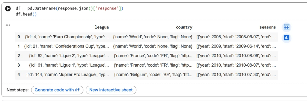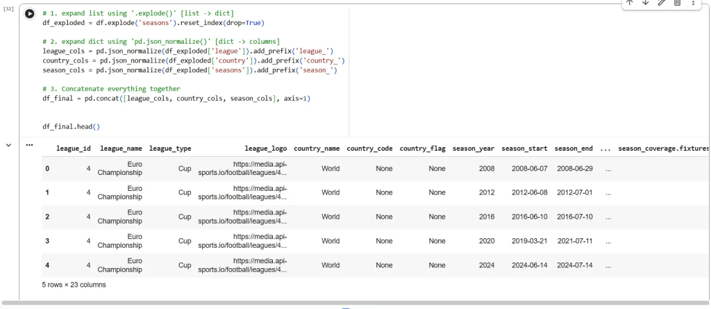 # 1. expand list using '.explode()' [list -> dict]df_exploded = df.explode('seasons').reset_index(drop=True)# 2. expand dict using 'pd.json_normalize()' [dict -> columns]league_cols = pd.json_normalize(df_exploded['league']).add_prefix('league_')country_cols = pd.json_normalize(df_exploded['country']).add_prefix('country_')season_cols = pd.json_normalize(df_exploded['seasons']).add_prefix('season_')# 3. Concatenate everything togetherdf_final = pd.concat([league_cols, country_cols, season_cols], axis=1)# Preview datadf_final.head()