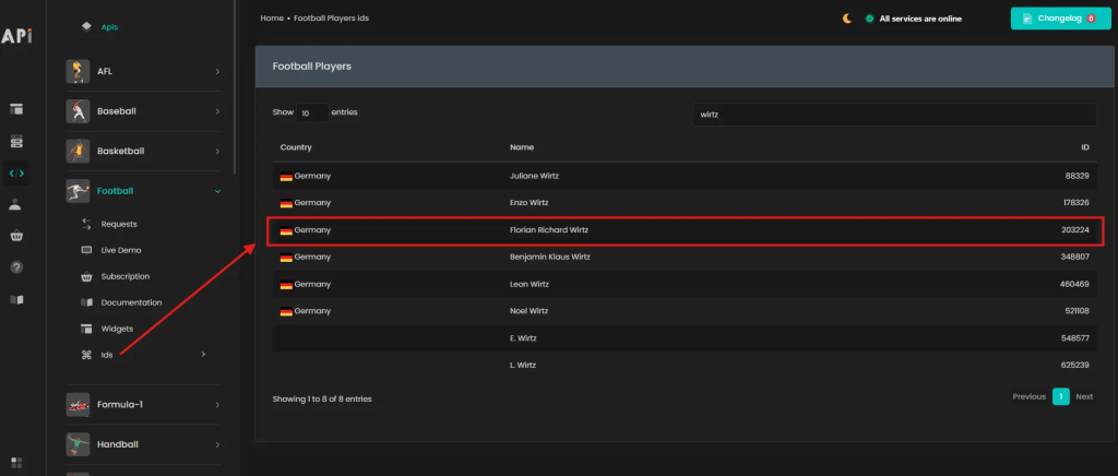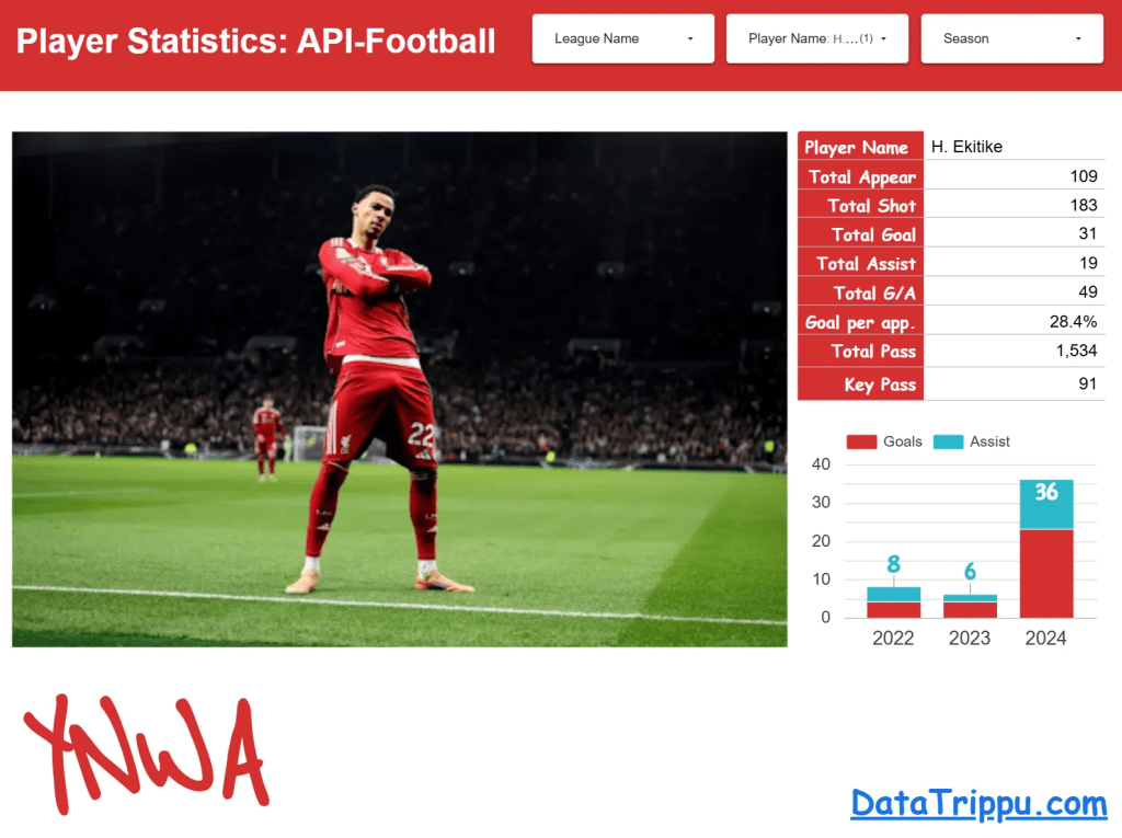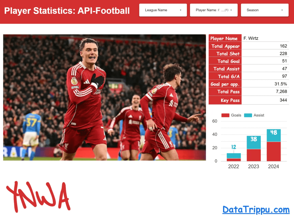อันนี้คือตัวอย่างที่ดึง Player statistics ขอนักเตะ Liverpool 2 คนมาดูคือ Florian Wirtz และ Hugo Ekitike โดนต้องรู้ Player id มาก่อน Get data