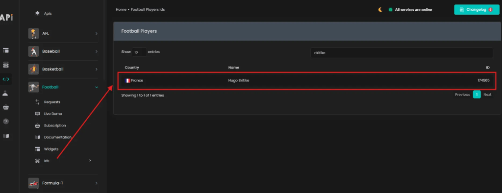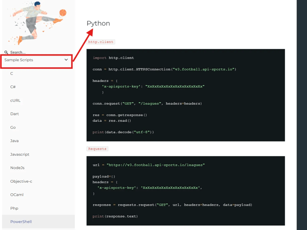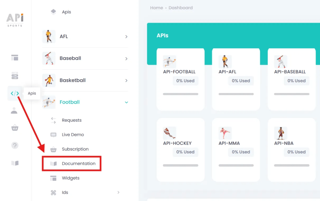 เพื่อนๆ สามารถเข้าไปดูได้ที่ Apis → Football → Documentation ในนี้จะมีตัวอย่าง Code ให้เราลองเล่นเยอะเลย