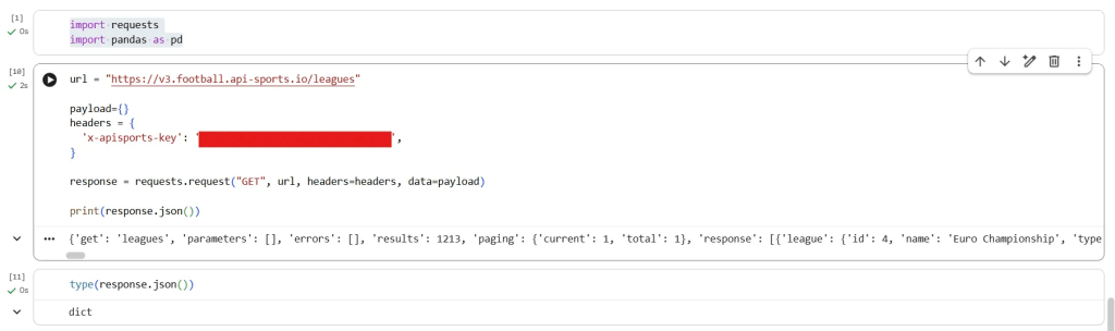 # Import library ที่จำเป็นimport requests #ใช้สำหรับ get data ผ่าน APIimport pandas as pd #ใช้สำหรับ Transform data url = "https://v3.football.api-sports.io/leagues"payload={}headers = { 'x-apisports-key': 'YOUR_API_KEY', # YOUR_API_KEY ได้มากจาก Account -> Access -> API Key}# Get data from APIresponse = requests.request("GET", url, headers=headers, data=payload)# Display resultprint(response.json())